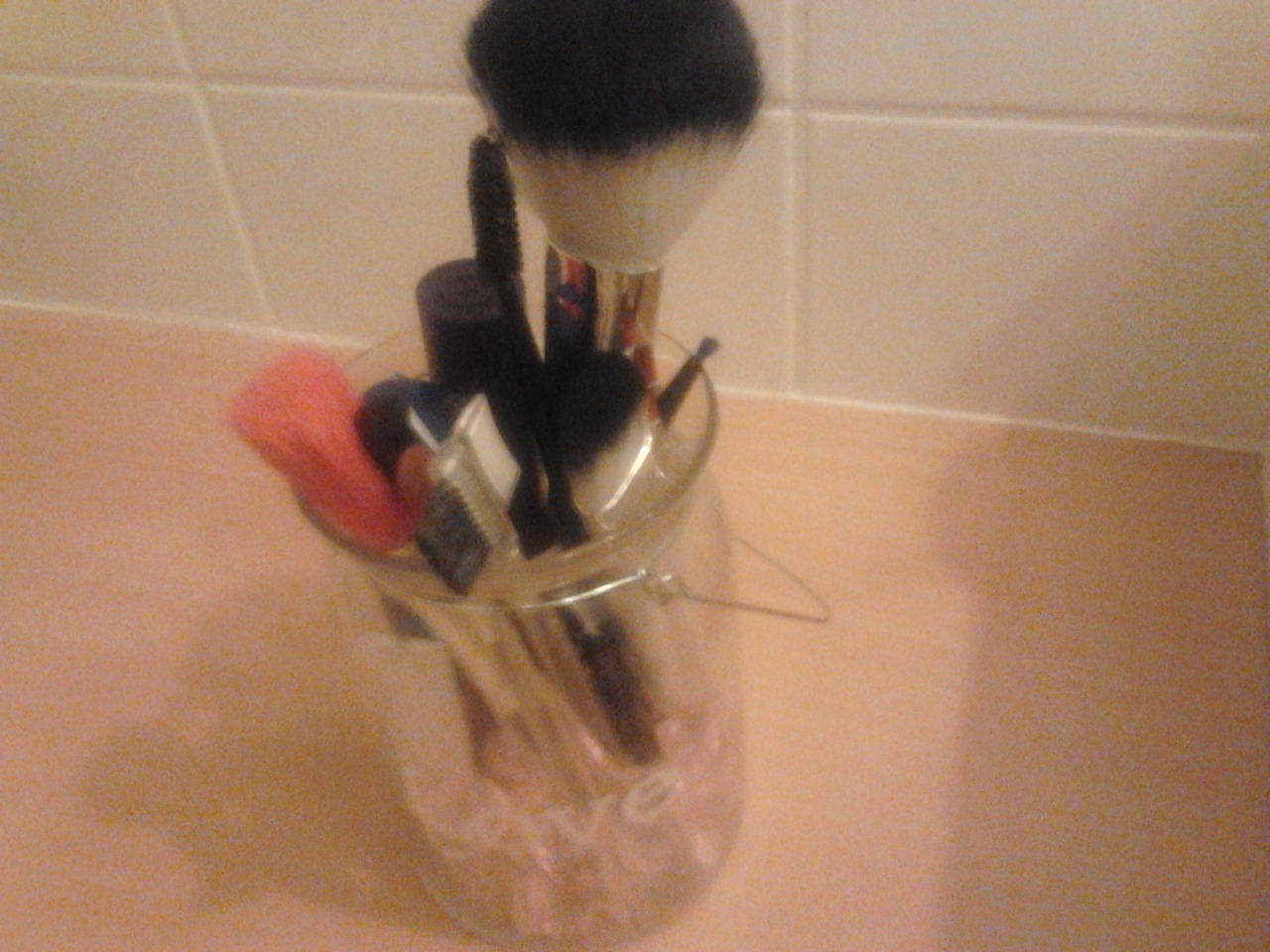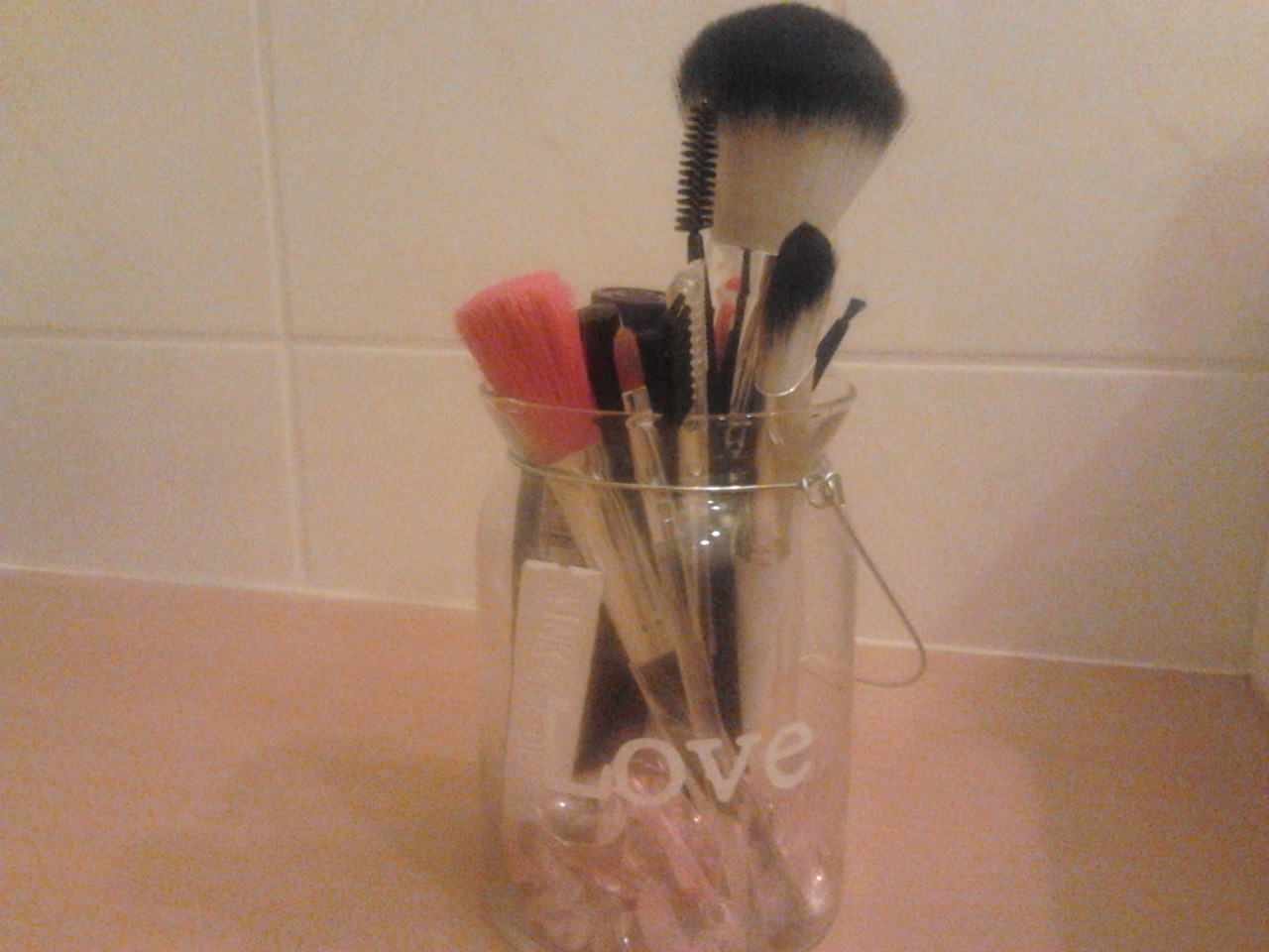 Dit is mijn kwastenpotje, eigenlijk best een grove naam zoals je in de titel ziet 'Kwastenpot' maar ik wist er even geen beter woord voor. In de foto hierboven zie je welke spullen ik er allemaal in heb zitten. Het zijn er best veel maar er zitten ook wat every-day producten bij. Het leuke potje waarop staat 'Love' en waarin de diamandjes zitten heb ik van mijn beste vriendin gekregen Minke .(www.pinkbeauty8.webnode.nl)